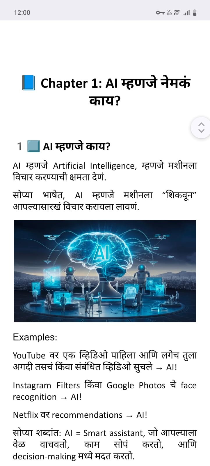 AI म्हणजे Artificial Intelligence — मशीनला मानवासारखं विचार करणं आणि निर्णय घेणं शिकवणं.हे आपल्या creativity आणि productivity ला turbo-boost देतं.