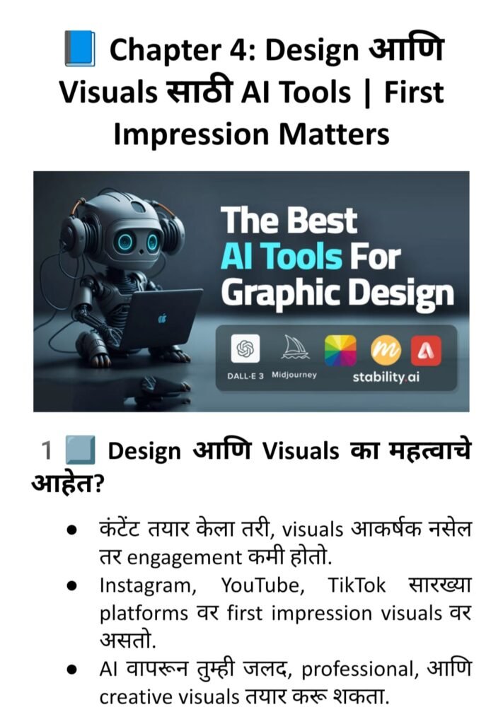 Use: Canva, Leonardo.ai, Adobe Firefly, DALL·E पोस्ट्स, थंबनेल्स, graphics आणि concept visuals तयार करायला perfect!
