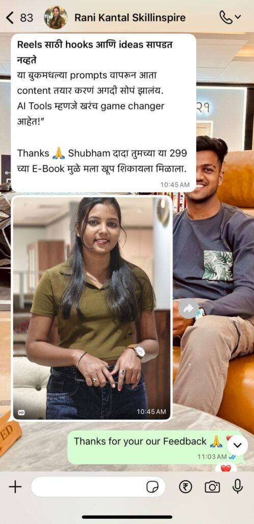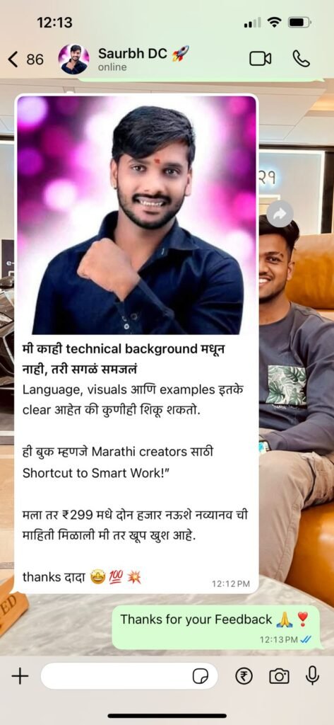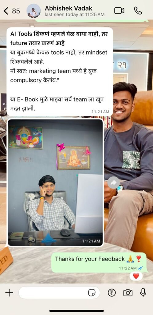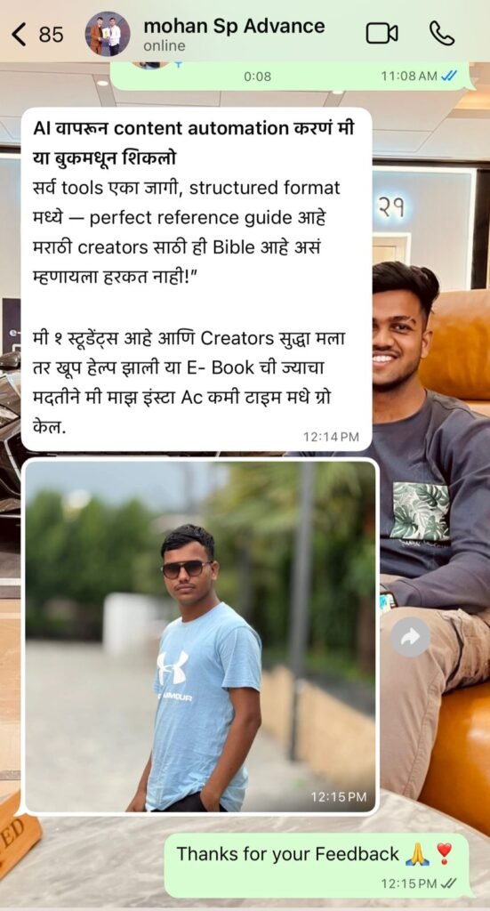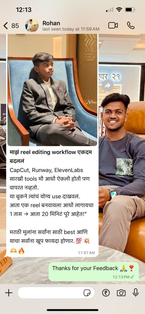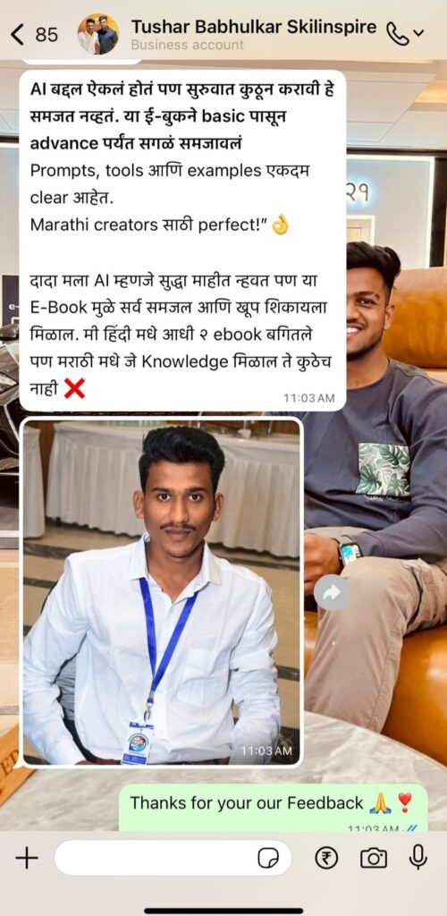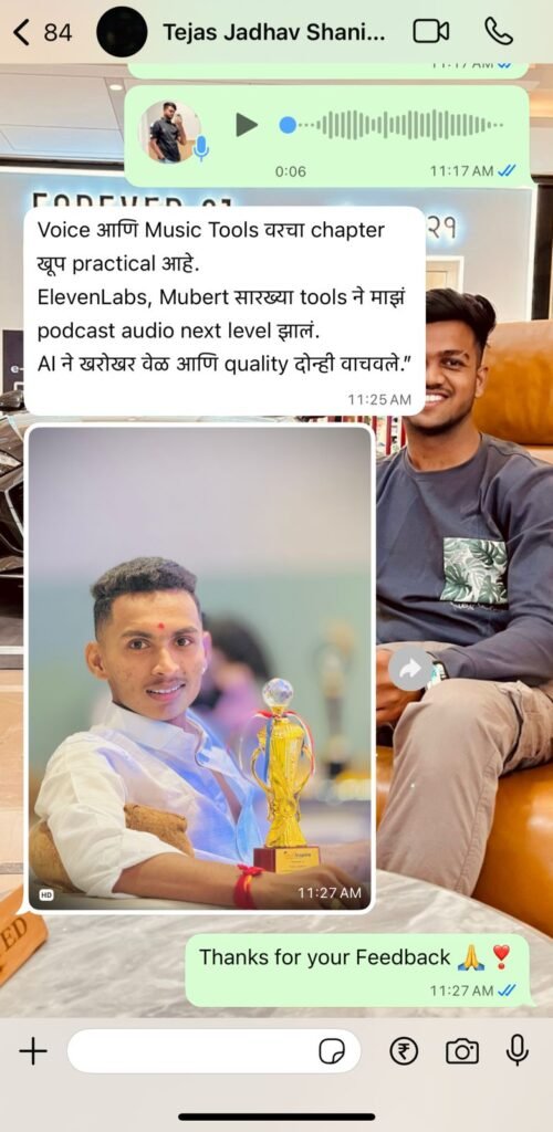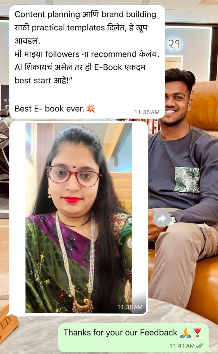 AI Tools वापरून Script Writing, Video Editing, Voiceover, Design आणि Branding कसं करायचं — याचं संपूर्ण practical मार्गदर्शन या एकाच ई-बुकमध्ये आहे.